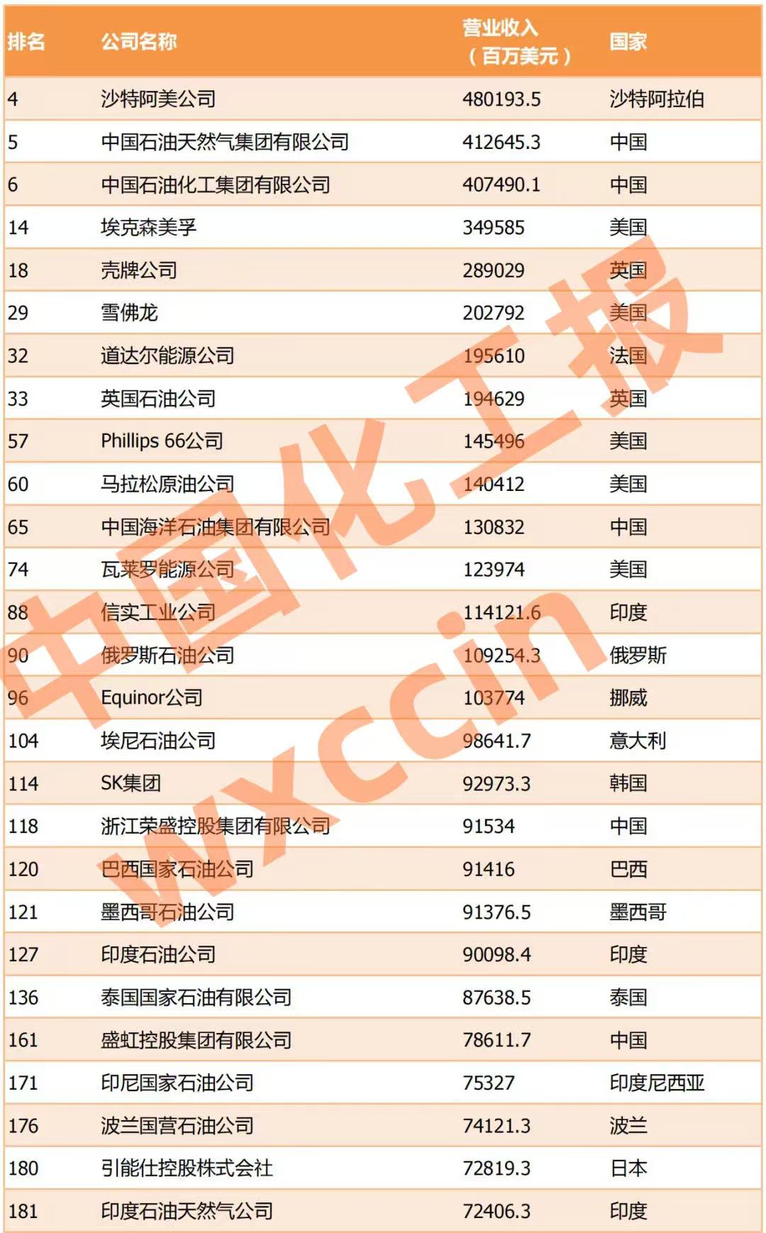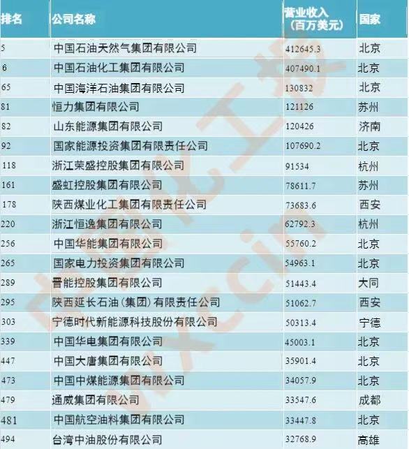 今年中国共有130家公司上榜,比去年减少3家,位居第二;总收入为10.7万亿美元,同比下降3%。总收入为10.7万亿美元,同比下降3%。上榜的中国能源化工企业共有21家。