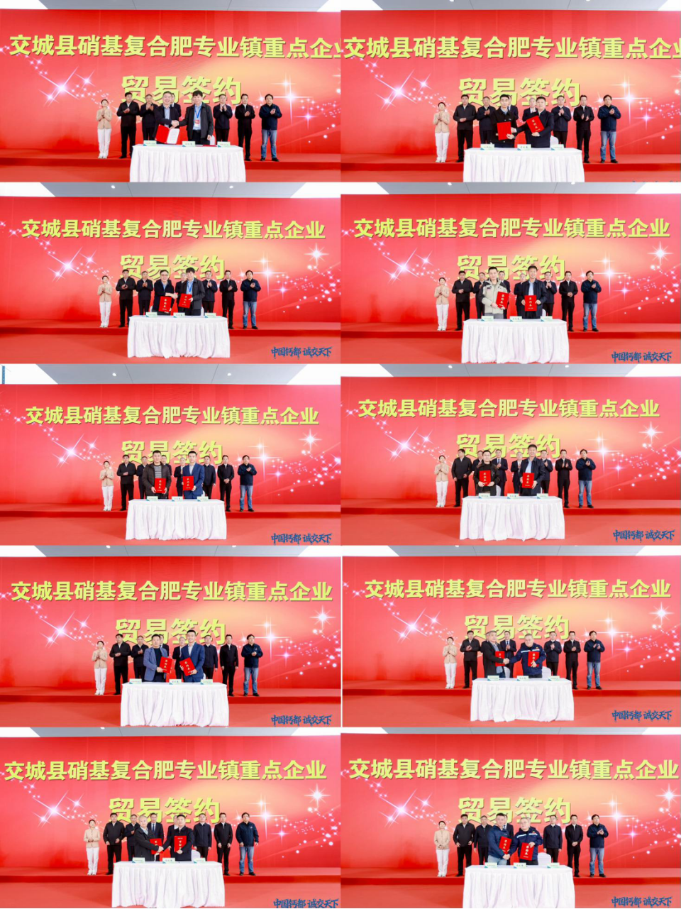 蓝图已经绘就,合作促成共赢。会上举行了交城县重点企业贸易签约仪式,交城三喜化工有限公司、山西华鑫肥业股份有限公司、山西金兰化工股份有限公司、交城县德谦肥业有限公司、山西磊鑫化工股份有限公司5家硝基肥骨干企业分别与合作伙伴进行了签约仪式,为产业共赢未来迈出了坚实的一步。签约现场,企业代表们满怀信心,共同期待通过合作实现资源共享、优势互补,共同开拓硝基肥市场新局面。