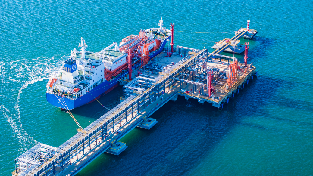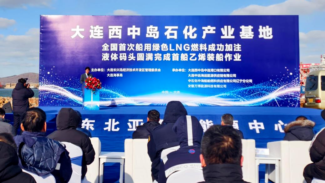 12月3日,大连长兴岛(西中岛)石化产业基地全国首次绿色LNG燃料加注暨液体码头首船乙烯装船作业仪式在西中岛液体码头举行,此次作业船舶系大连中远海运能源供应链有限公司“兴盛源”轮,标志着基地在“原料接卸-生产加工-成品发货”全链条物流体系上实现关键突破,为打造大连东北亚氢基能源中心、推动大连“三个中心”建设和东北全面振兴注入强劲动力。区党工委委员、管委会副主任常剑峰出席仪式并致辞。