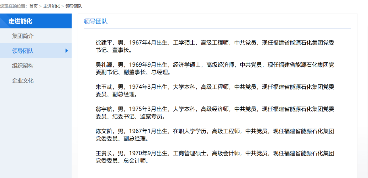 徐建平,男,1967年4月出生,工学硕士,高级工程师,中共党员,现任福建省能源石化集团党委书记、董事长。