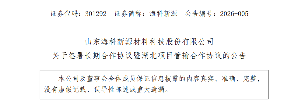 1月26日,山东海科新源材料科技股份有限公司(以下简称“海科新源”)发布公告称,海科新源与深圳市比亚迪锂电池有限公司(以下简称“比亚迪锂电池”)于2026年1月23日签署《长期合作协议暨湖北项目管输合作协议》(以下简称“本协议”)。协议约定,协议有效期为3年,在协议有效期内,海科新源以管输方式向比亚迪锂电池湖北项目供应协议所购产品每年至少10万吨。