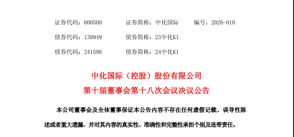 同日,中化国际(控股)股份有限公司第十届董事会第十八次会议决议公告称,鉴于张学工先生因工作变动原因已申请辞去公司董事长、董事及董事会专门委员会委员等相关职务,董事会同意选举董事、总经理庞小琳先生为公司新任董事长,并担任公司董事会战略委员会及可持续发展委员会主席,任期自董事会审议通过之日起至公司第十届董事会任期届满之日止。