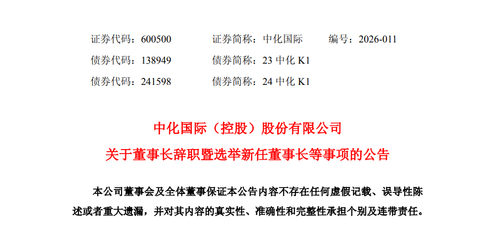 2月14日,中化国际发布公告称,公司董事会于近日收到公司董事长张学工先生的辞呈。因工作变动原因,张学工先生申请辞去公司董事长、董事及董事会专门委员会相关职务,辞职后张学工先生将不再担任公司任何职务。