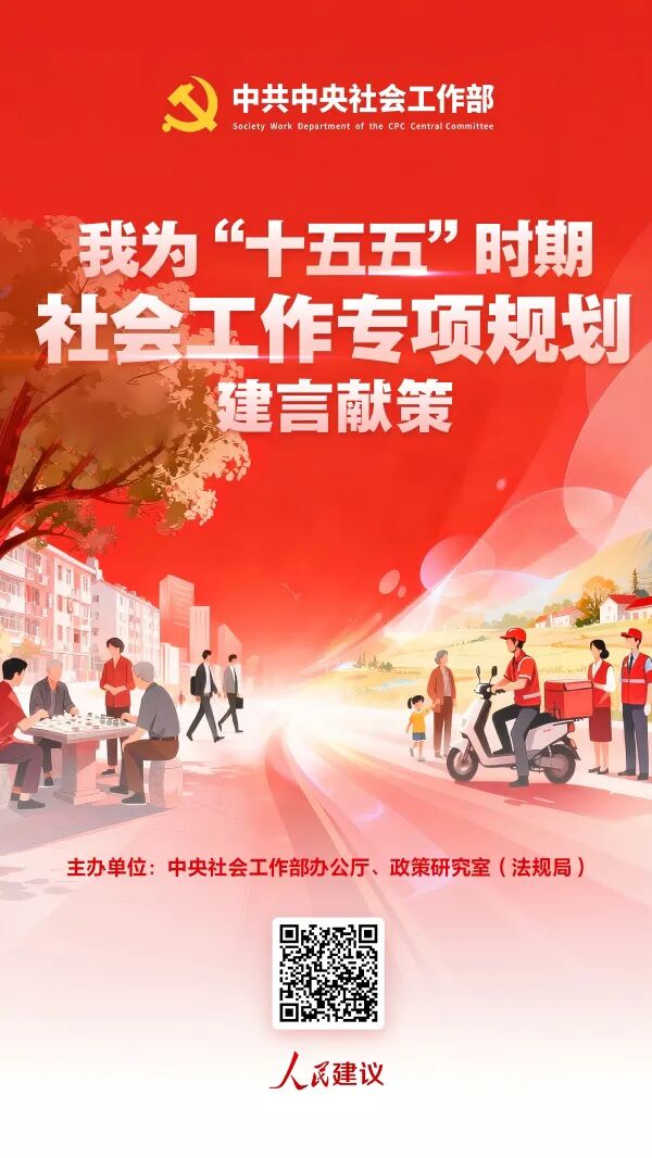 为深入学习贯彻党的二十届四中全会精神,贯彻落实习近平总书记对“十五五”规划编制工作的重要指示精神,坚持科学决策、民主决策、依法决策,高质量编制“十五五”时期社会工作专项规划,即日起至3月5日,中央社会工作部通过人民网“人民建议”开展“我为‘十五五’时期社会工作专项规划建言献策”建议征集(点击参与)活动,诚邀社会各界,共绘“十五五”社会工作高质量发展蓝图。