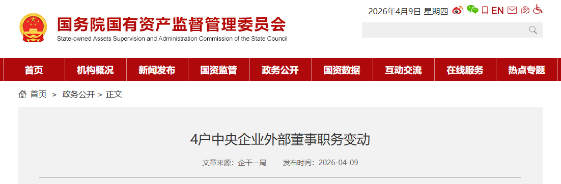4月9日,国务院国资委网站发布4户中央企业外部董事职务变动。其中涉及中国海洋石油集团有限公司和中国大唐集团有限公司。