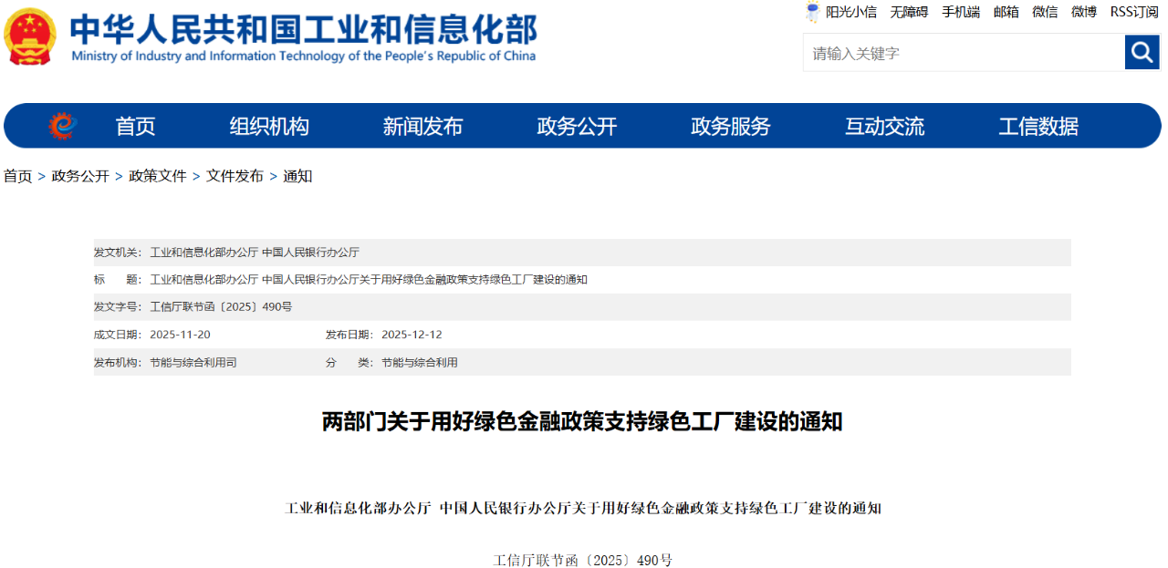 工信部与中国人民银行联合印发《关于用好绿色金融政策支持绿色工厂建设的通知》