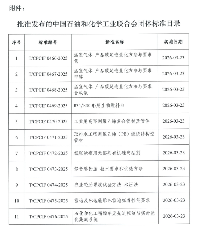 中国石油和化学工业联合会近日发布公告,批准《温室气体 产品碳足迹量化方法与要求 氢》等11项团体标准,内容覆盖氢、甲醇、合成氨的碳足迹量化以及船用生物燃料、环保管材等多个重点领域,全部标准将于2026年3月23日起正式实施。