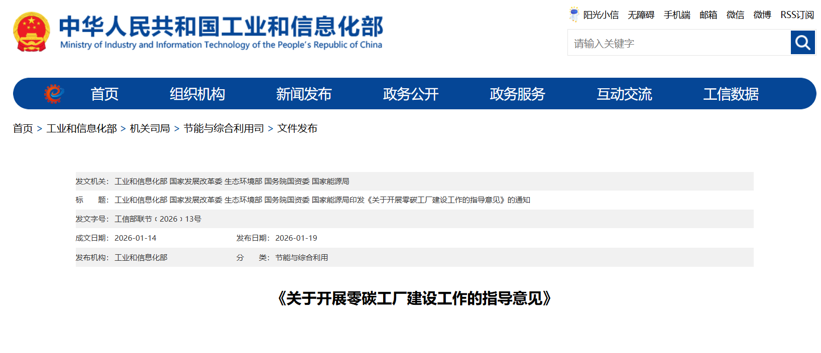 近日,工业和信息化部、国家发展改革委、生态环境部、国务院国资委、国家能源局等五部门联合印发《关于开展零碳工厂建设工作的指导意见》(工信部联节〔2026〕13号,以下简称《指导意见》),深挖工业和信息化领域节能降碳潜力,带动重点行业领域减碳增效和绿色低碳转型,培育发展新质生产力。