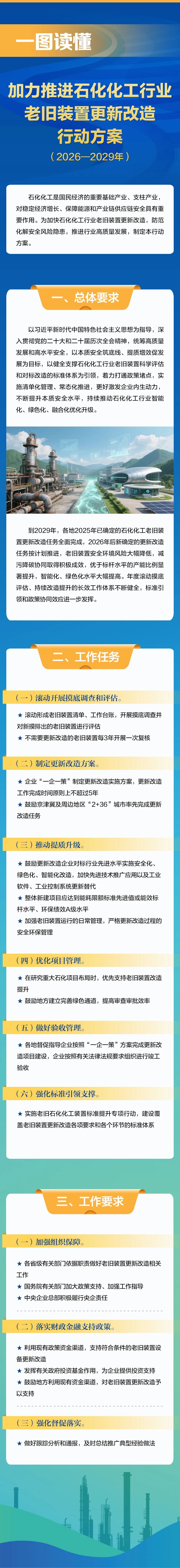 近日,工业和信息化部、国家发展改革委、生态环境部、应急管理部、中国人民银行、国务院国资委、市场监管总局等七部门联合印发《加力推进石化化工行业老旧装置更新改造行动方案(2026-2029年)》(以下简称《行动方案》)。