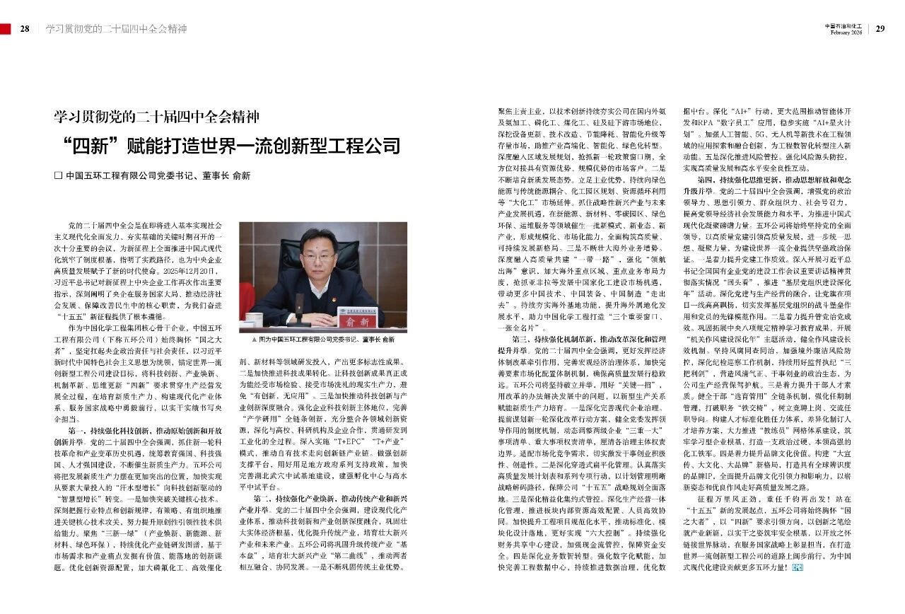 第二,持续强化产业焕新,推动传统产业和新兴产业并举。党的二十届四中全会强调,建设现代化产业体系,推动科技创新和产业创新深度融合,巩固壮大实体经济根基,优化提升传统产业,培育壮大新兴产业和未来产业。五环公司将巩固升级传统产业“基本盘”,培育壮大新兴产业“第二曲线”,推动两者相互融合、协同发展。一是不断巩固传统主业优势。聚焦主责主业,以技术创新持续夯实公司在国内外氨及氨加工、磷化工、煤化工、硅及硅下游市场地位,深挖设备更新、技术改造、节能降耗、智能化升级等存量市场,助推产业高端化、智能化、绿色化转型。深度融入区域发展规划,抢抓新一轮政策窗口期,全方位对接具有资源优势、规模优势的市场客户。二是不断培育新质发展态势。立足主业优势,持续向绿色能源与传统能源耦合、化工园区规划、资源循环利用等“大化工”市场延伸。抓住战略性新兴产业与未来产业发展机遇,在新能源、新材料、零碳园区、绿色环保、运维服务等领域催生一批新模式、新业态、新产业,形成规模化、市场化能力,全面构筑高质量、可持续发展新格局。三是不断壮大海外业务增势。深度融入高质量共建“一带一路”,强化“领航出海”意识,加大海外重点区域、重点业务布局力度,抢抓亚非拉等发展中国家化工建设市场机遇,带动更多中国技术、中国装备、中国制造“走出去”。持续夯实海外基地功能,提升海外属地化发展水平,助力中国化学工程打造“三个重要窗口、一张金名片”。