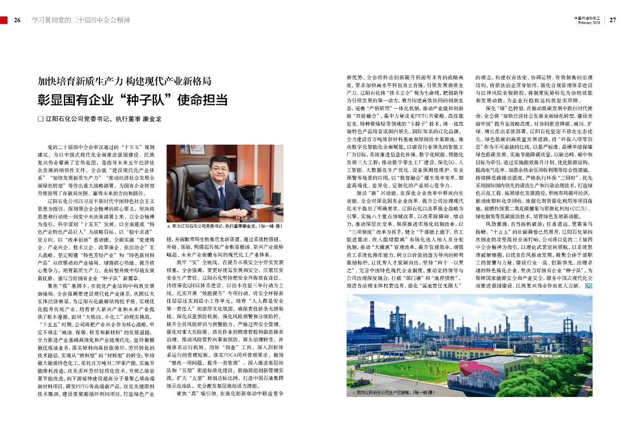 辽阳石化公司以习近平新时代中国特色社会主义思想为指引,深刻领会全会精神的核心要义,坚决将思想和行动统一到党中央决策部署上来,以全会精神为指引,科学谋划“十五五”发展,以全面建成“特色产业特色产品巨人”为战略目标,以“稳中求进”定方向,以“改革创新”蓄动能,全面实施“党建铸企、产业兴企、技术立企、改革强企、依法治企”五大战略,坚定构建“特色芳烃产业”和“特色新材料产品”双核驱动的产业格局,增强核心功能、提升核心竞争力,培育新质生产力,在转型升级中厚植发展新优势,谱写当好国有企业“种子队”新篇章。