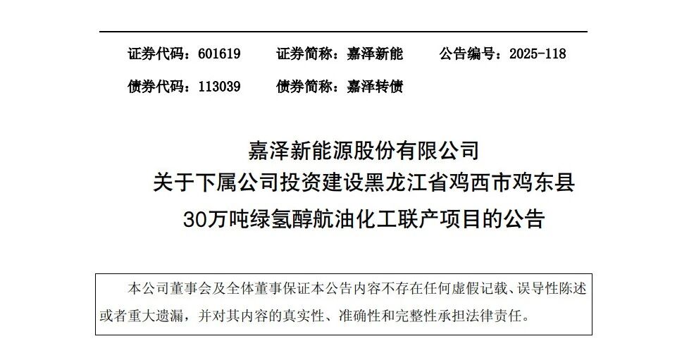 12月14日,嘉泽新能发布公告称,为满足公司生产经营和发展战略的需要,上海嘉益荣源全资子公司黑龙江嘉益荣源绿色化工有限公司(以下简称“黑龙江嘉益荣源”)拟采用自有和向金融机构融资等方式筹措资金,投资建设黑龙江省鸡西市鸡东县30万吨绿氢醇航油化工联产项目,上述绿氢醇项目计划总投资约355,660.38万元。