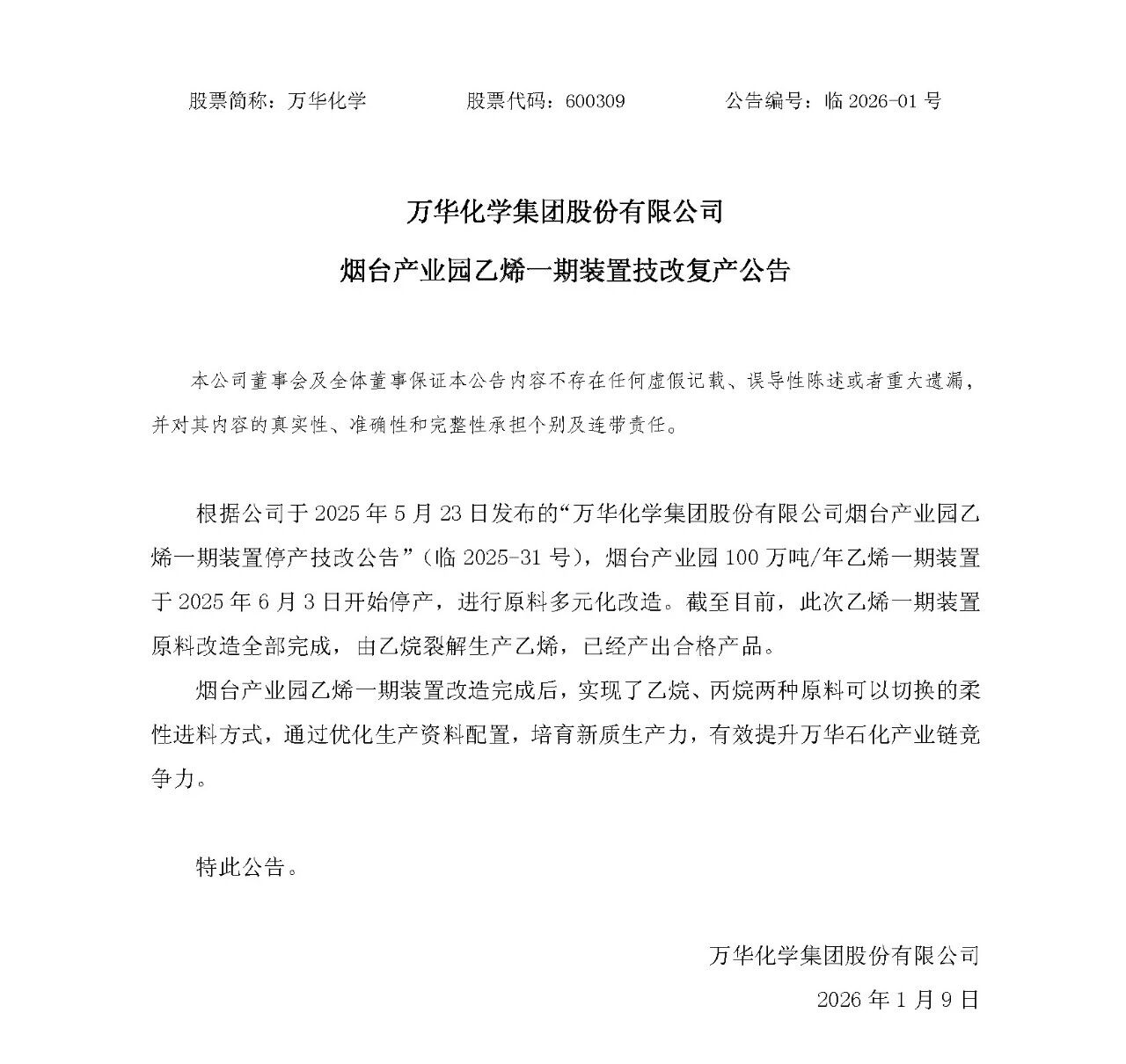 根据公司于2025年5月23日发布的“万华化学集团股份有限公司烟台产业园乙烯一期装置停产技改公告”(临2025-31号),烟台产业园100万吨/年乙烯一期装置于2025年6月3日开始停产,进行原料多元化改造。