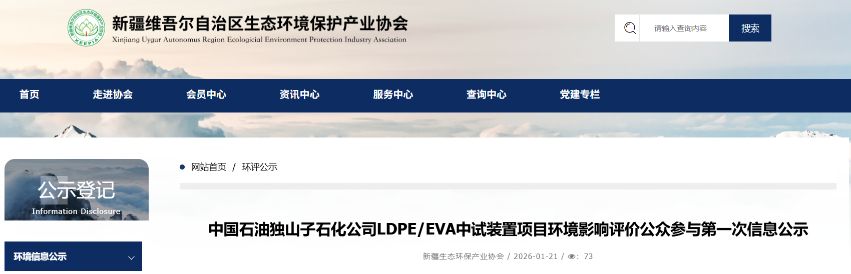 1月21日,新疆维吾尔自治区生态环境保护产业协会发布公告,中国石油独山子石化公司LDPE/EVA中试装置项目环境影响评价公众参与第一次信息公示。