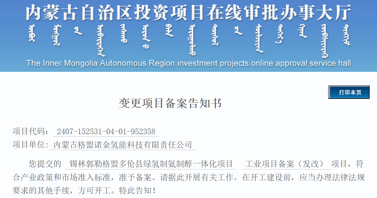 1月26日,内蒙古自治区投资项目在线审批办事大厅发布变更项目备案告知书,锡林郭勒格盟多伦县绿氢制氨制醇一体化项目准予备案。